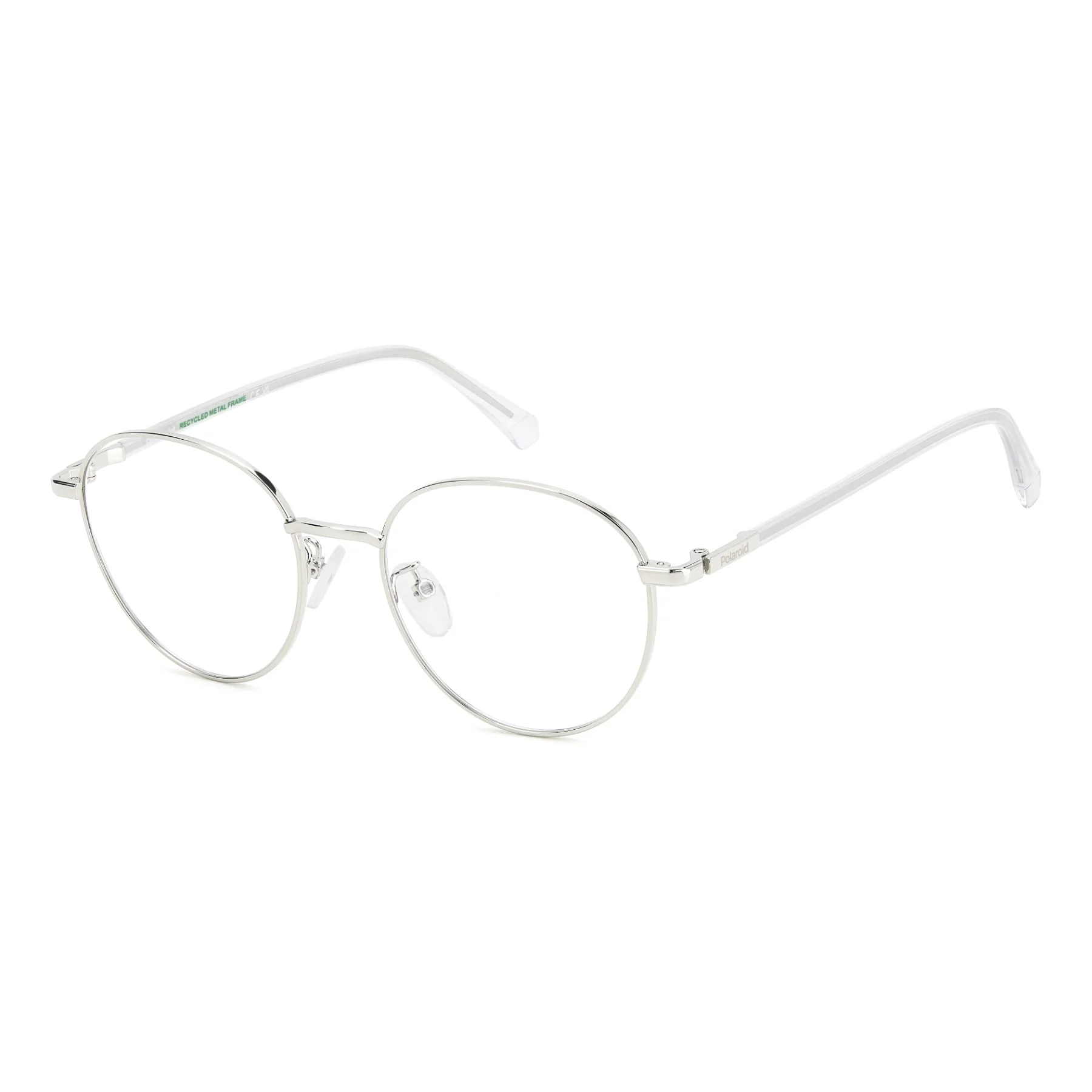 These unisex eyeglasses by Polaroid have pantos frames and a slender structure in recycled stainless steel. Their rigorous and slightly intellectual character is balanced by the playful transparent end tips with a visible core. They're perfect for men or women, as part of street-style looks or even with formal wear. The elements designed for comfort abound: adjustable nose pads, two different frame sizes, and a Global Fit.