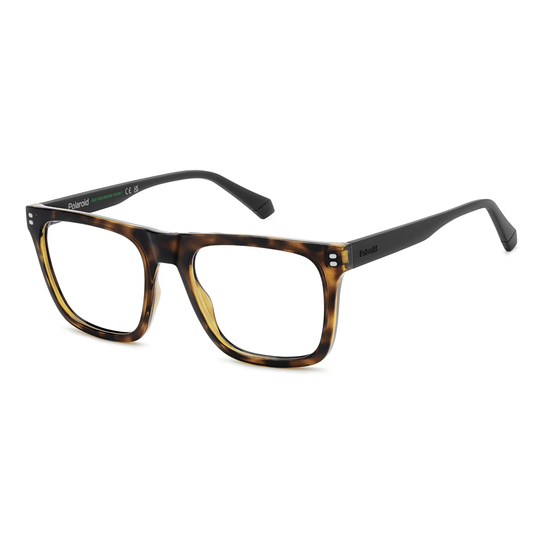 Polaroid eyeglasses for boys ages 11 to 15. Easy to wear, their comfort is guaranteed by rubber temples and lightweight construction, perfect for everyday use. Made with sustainable materials, these glasses are in-line with Polaroid's green commitment. Their contemporary style arises from the rectangular frames that are flat along the top, decorated by printed rivets. The Polaroid logo is raised, for a cool touch.
